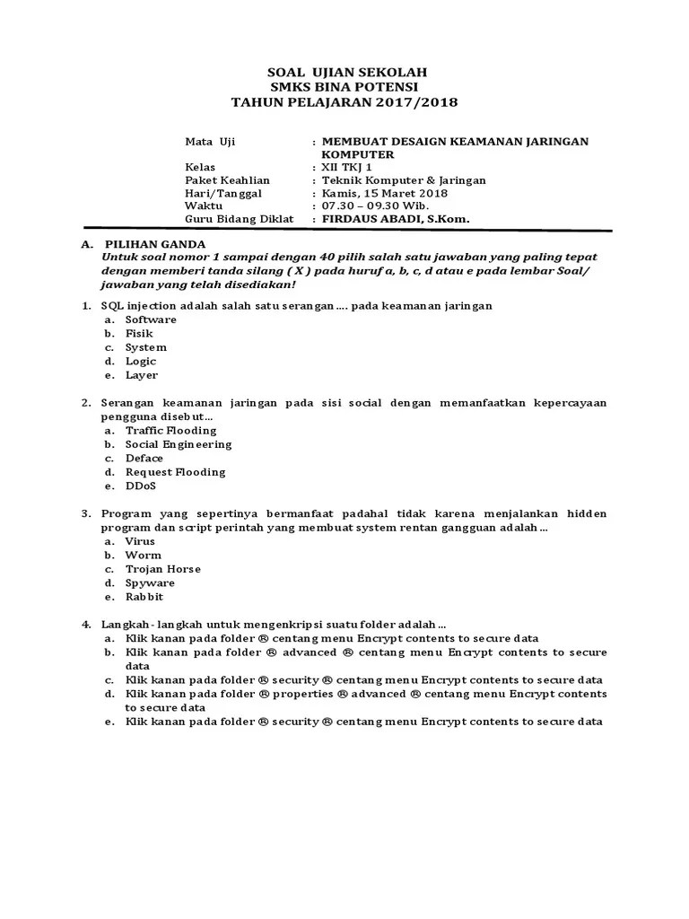 Serangan terhadap keamanan sistem informasi (security attack) dewasa ini seringkali terjadi. Sql injection adalah salah satu serangan pada keamanan jaringan. Sistem keamanan jaringan yang terdiri dari 30 soal pilihan ganda. Bisa sebagai bahan pembelajaran dan latihan sebelum menghadapi ujian. Kejahatan computer (cyber crime)pada dunia maya . Soal keamanan jaringan smk tkj beserta jawabannya. Sistem keamanan komputer merupakan sebuah upaya yang dilakukan untuk.